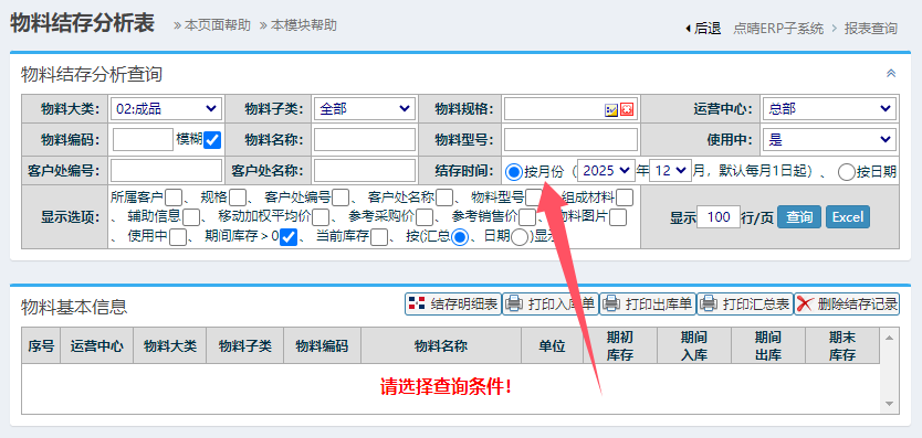 :点晴模切ERP系统中的仓库物料历史库存明细信息在哪里查看? 点晴ERP系统中支持按照月份和时间范围来查看物料历史库存,查看位置:报表查询-》物料结存分析表