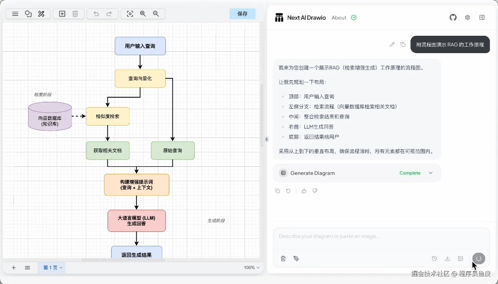 这个项目支持在线体验,你可以完全从 0 开始画图,比如画一个流程图,演示 RAG 的工作原理。