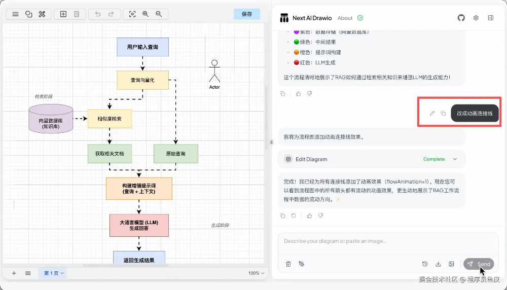 也可以通过 AI 对话让它帮你修改,比如改成动画连接线,逼格一下子就上来了。