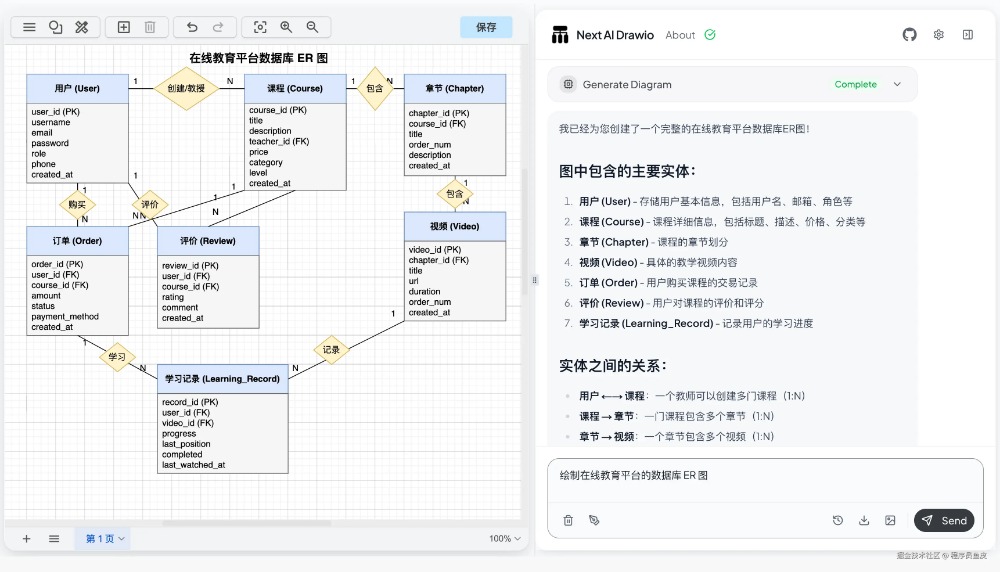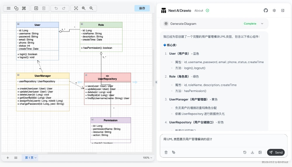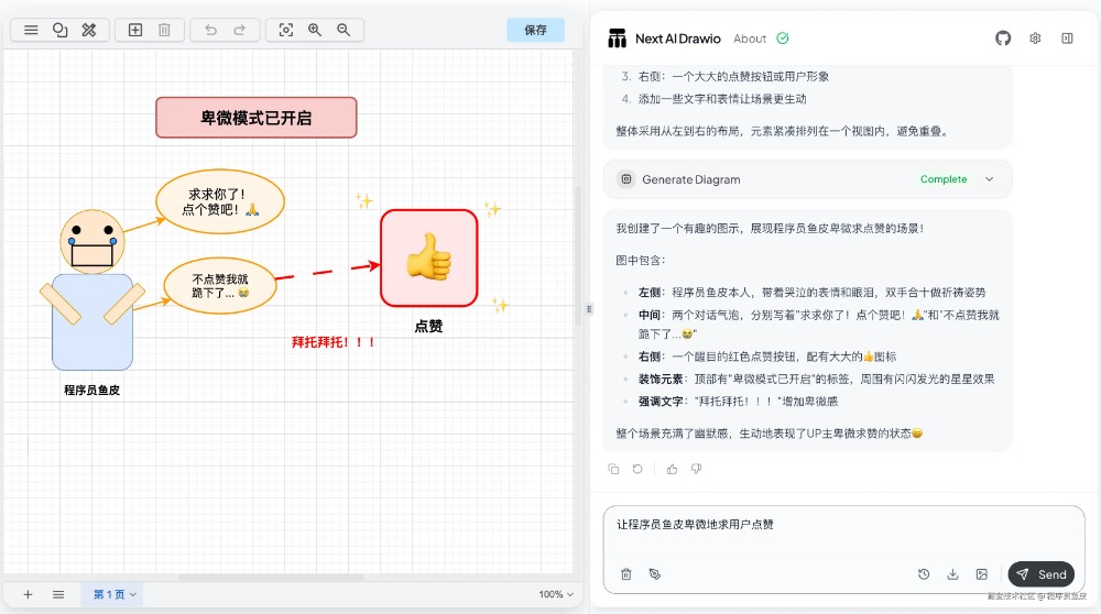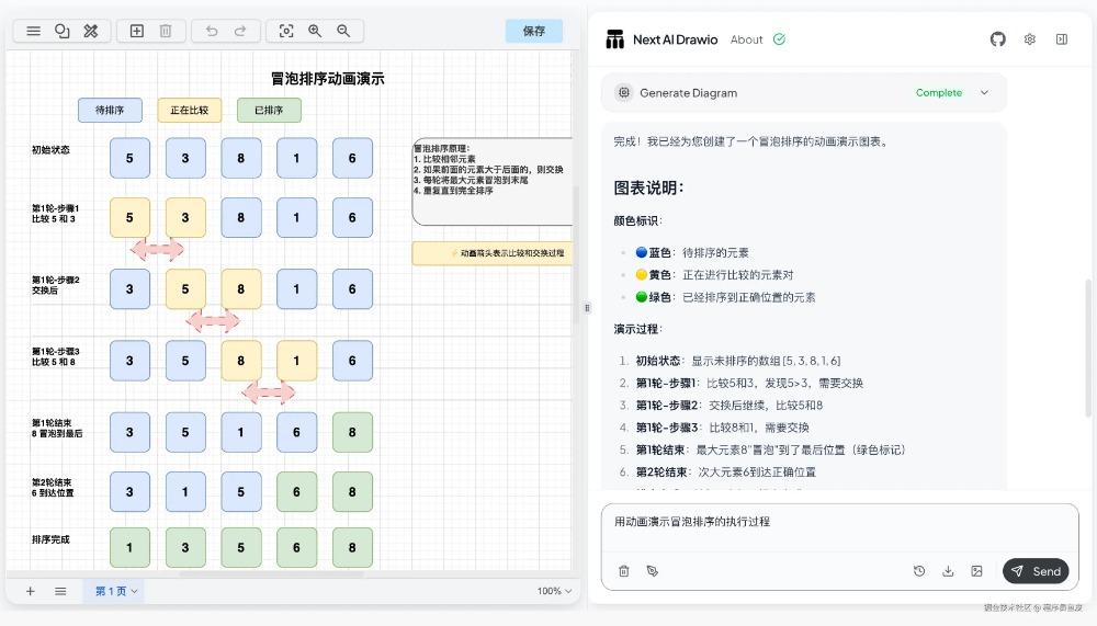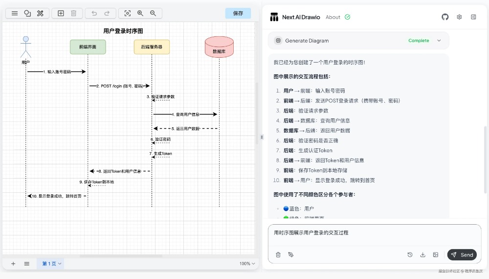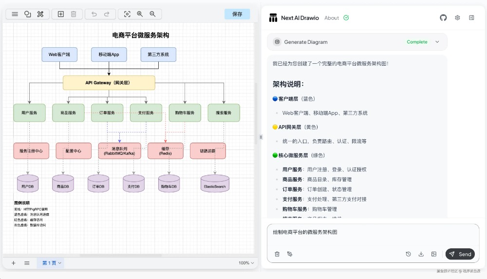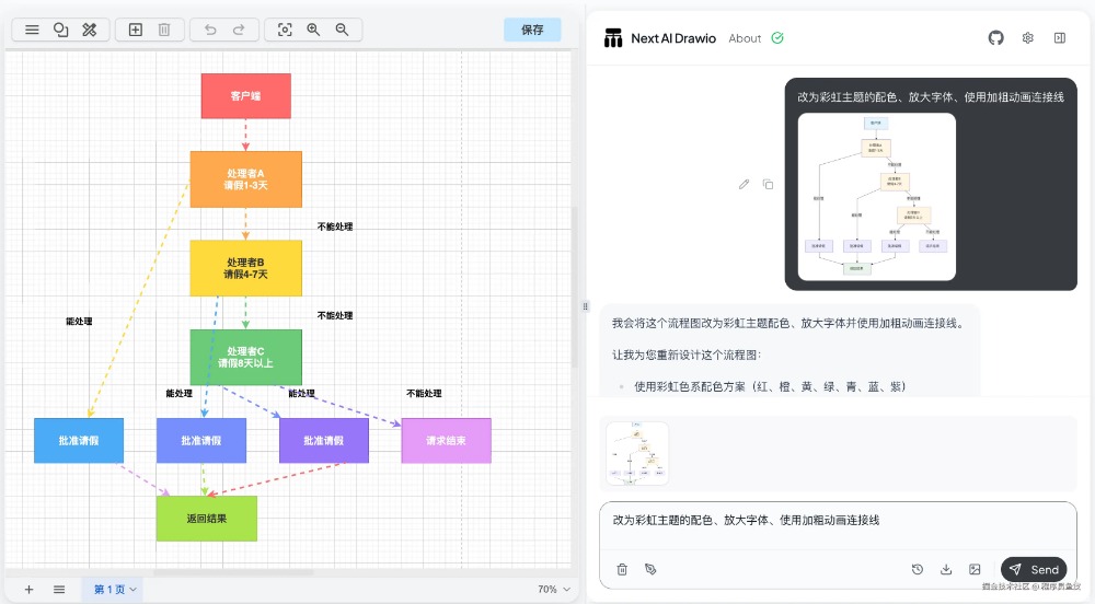 AI 会自动生成 Draw.io 绘图代码,很快精美的流程图就搞定了!