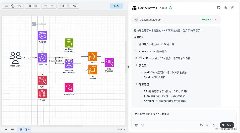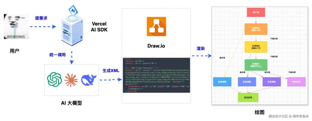 最后多说两句,这个项目的实现其实并不复杂。作者通过集成 Vercel AI SDK 轻松对接各种大模型,让 AI 生成 draw.io 能理解的 XML 代码。