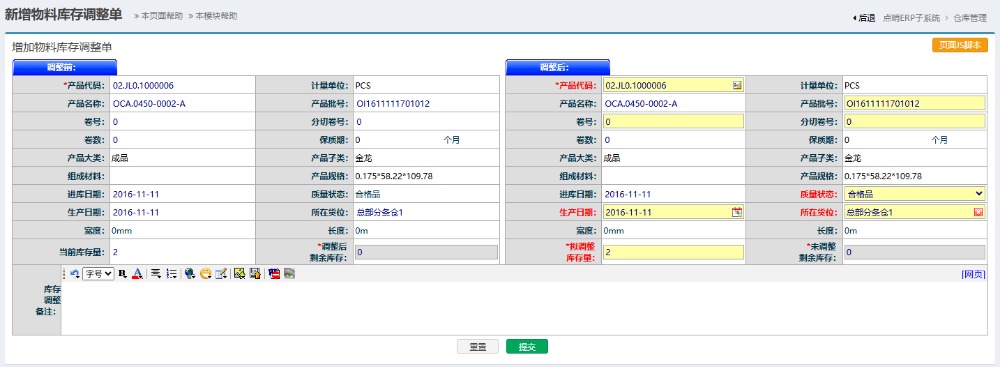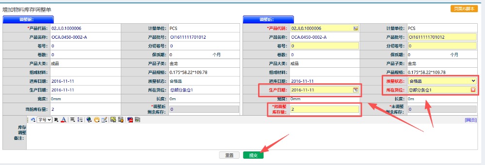 ![]() 在此页面可进行数量,货位,质量状态,生产日期等资料的调整。填好必要信息后,点击“提交”即可。