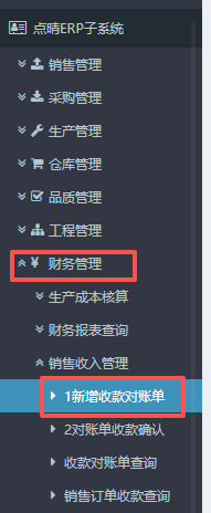 ​:点晴ERP-收款对账单流程 1.进入ERP系统之后,在左侧的功能菜单里找到“财务管理”,点开“销售收入管理”,点击“新增收款对账单”。 2.点击进入页面之后,选择收货单位,点击查询。 3.查询之后,在下方会得出对应的收款对账单,确认对账单价以及收货数量、待收款,点击确认复核和收款,最后点击提交。 ...