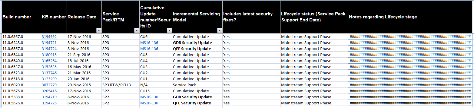 请点击下面链接下载,包括2005~2016所有版本的构建版本号,KB号、发行日期、SP\CU等信息,如下图(十三)所示: