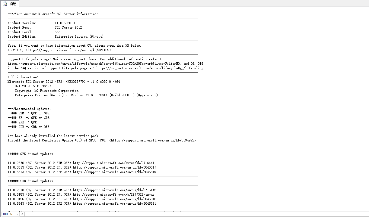 在 SQL Server Management Studio 中通过执行下面脚本获取版本号信息,结果如下图(七)所示