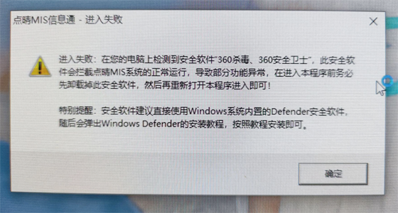 安装点晴MIS信息通PC客户端后进入失败,提示电脑上检测到360杀毒及安全卫士,禁止运行,如何解决?