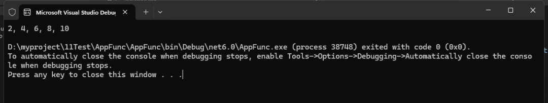 static void Main(string[] args){    // 使用    List<int> numbers = new List<int> { 1, 2, 3, 4, 5, 6, 7, 8, 9, 10 };    List<int> evenNumbers = FilterList(numbers, n => n % 2 == 0);    Console.WriteLine(string.Join(", ", evenNumbers));}