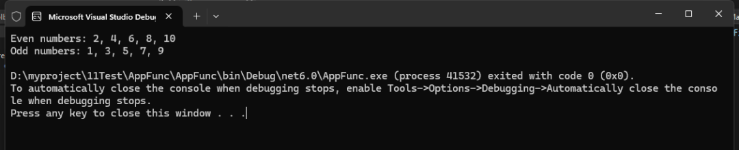 Console.WriteLine($"Even numbers: {string.Join(", ", evenNumbers)}");    Console.WriteLine($"Odd numbers: {string.Join(", ", oddNumbers)}");}