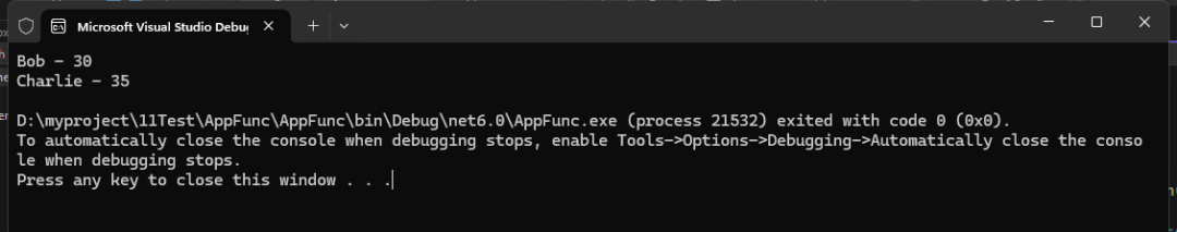 foreach (var person in filteredPeople)    {        Console.WriteLine($"{person.Name} - {person.Age}");    }}