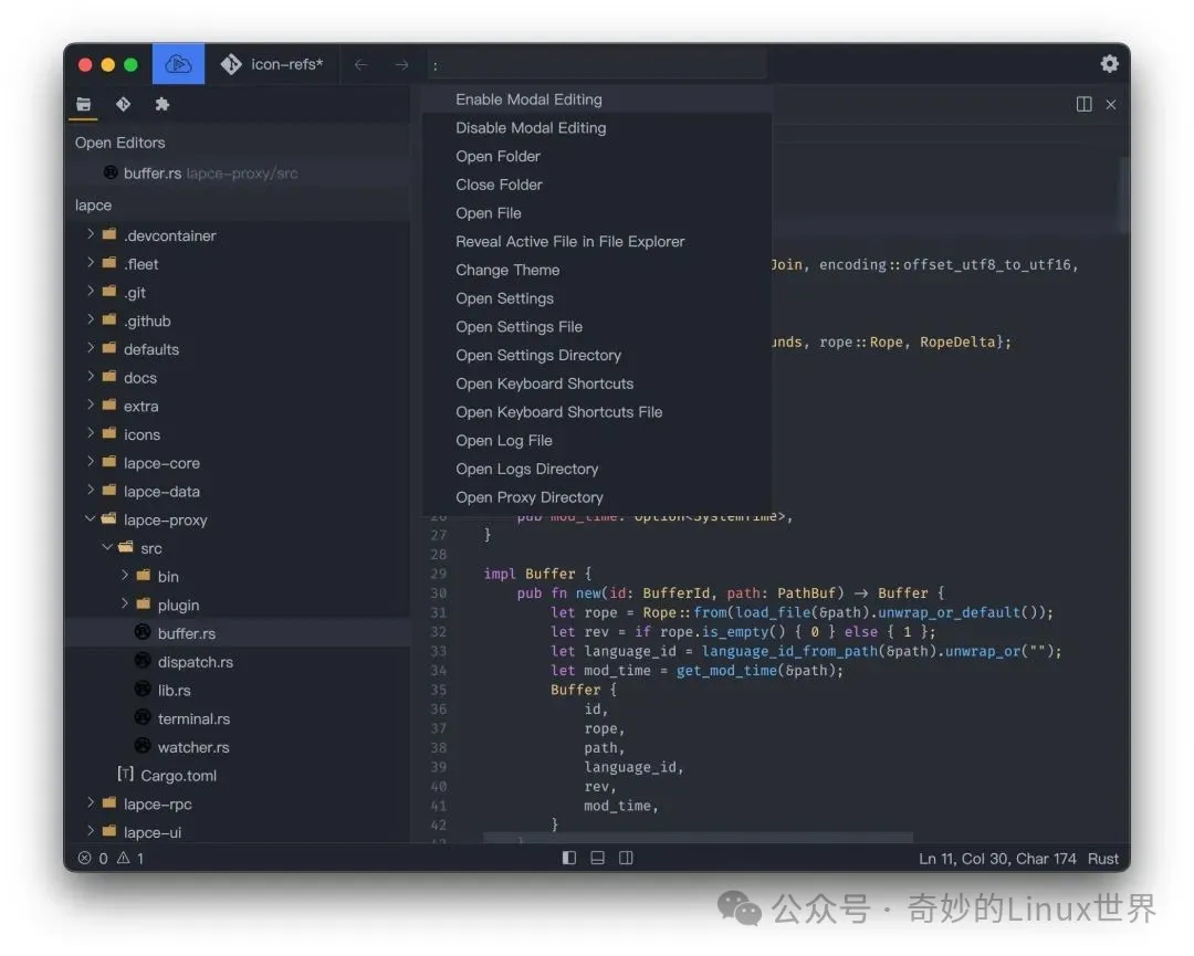 3. Vim 风格的模态编辑如果你是 Vim 爱好者,Lapce 绝对是你的菜!它内置了类 Vim 的模态编辑,支持快捷键切换,熟悉的 hjkl 移动和命令模式一应俱全。即便你是新手,也可以轻松切换到普通模式,灵活适应。