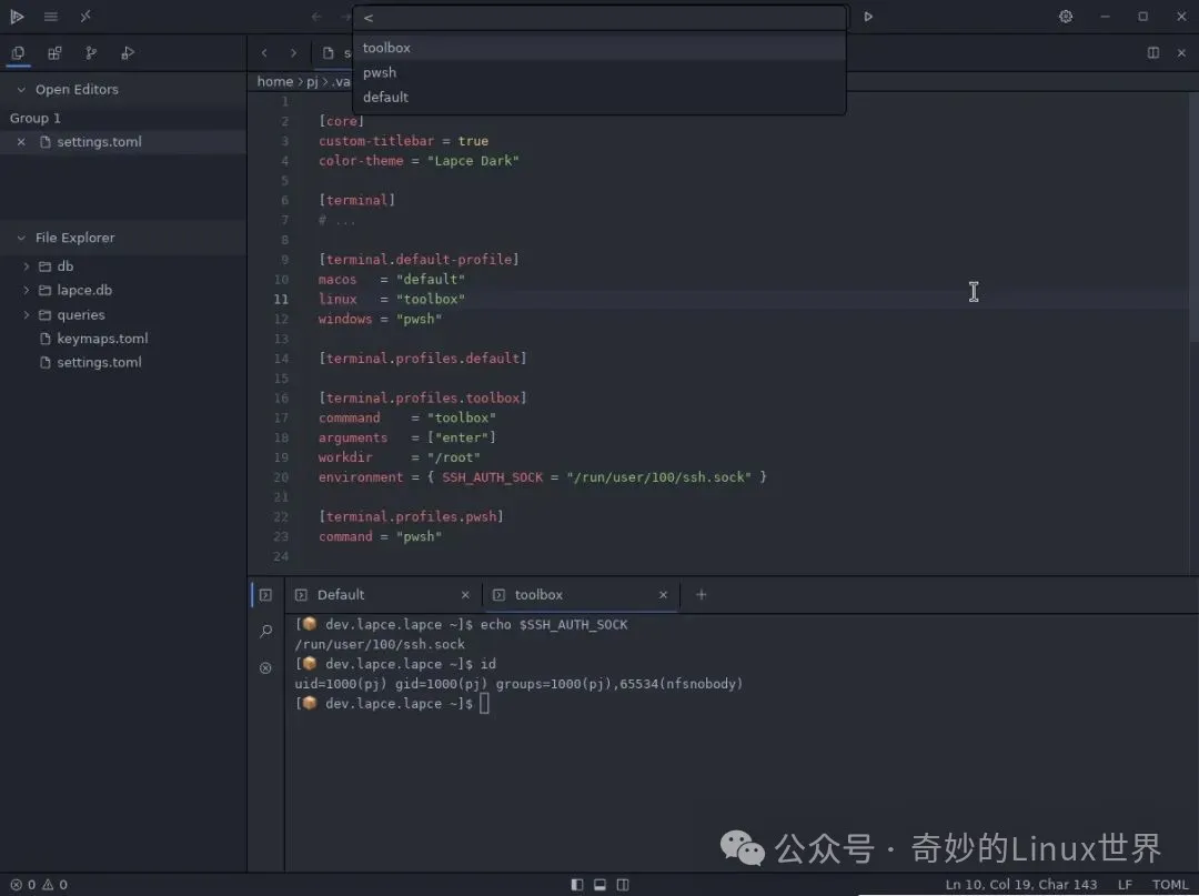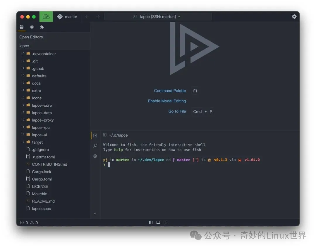 4. 远程开发,丝滑体验 Lapce 的远程开发功能灵感来自 VS Code。它通过代理和插件架构,让你在本地编辑代码时,享受远程服务器的计算能力。搭配 Lapdev,你还能轻松管理远程开发环境,省去繁琐的环境配置时间。