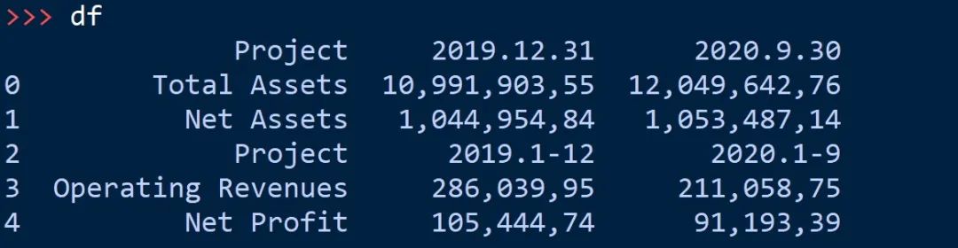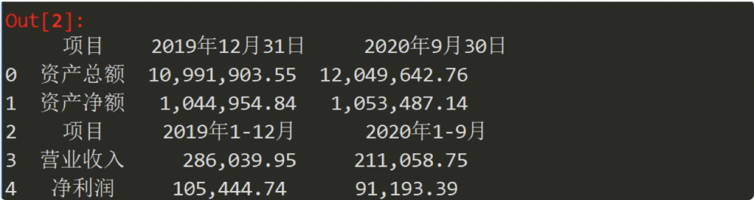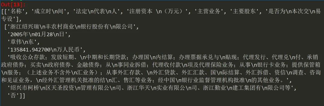 可以看到,只是将全部表格文本提取出来,但实际上第一个表格又细分为两个表,所以需要我们进一步修改,将这张表再次拆分!例如提取上半部分代码如下: