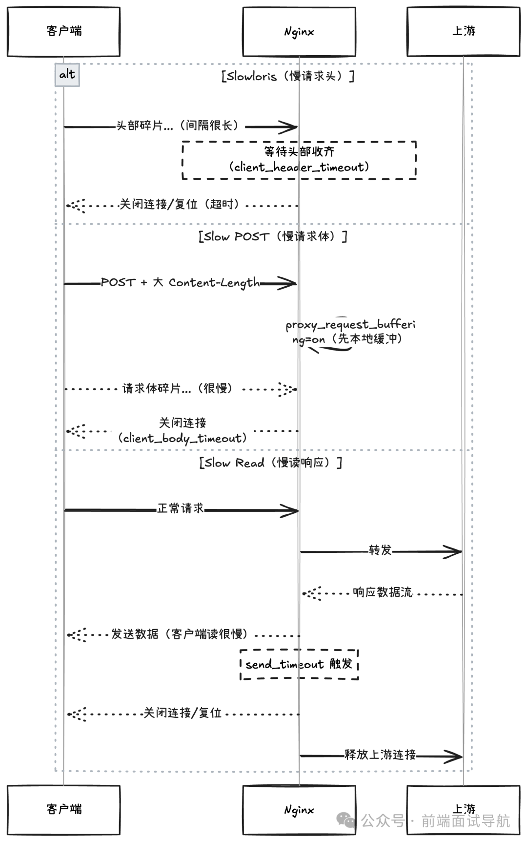 核心目标就是尽快关闭拖延发送请求头/请求体或极慢读取响应的连接,限制单 IP 的并发与速率,避免慢连接占满 worker 的 worker_connections 与上游资源。