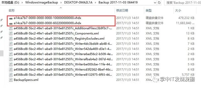 6、备份完成后,我们还要核对一下备份的文件,按照你选择的备份地址,“WindowsImageBackup”目录就是备份文件的保存目录,那2个“vhdx”文件就是备份的核心文件了。