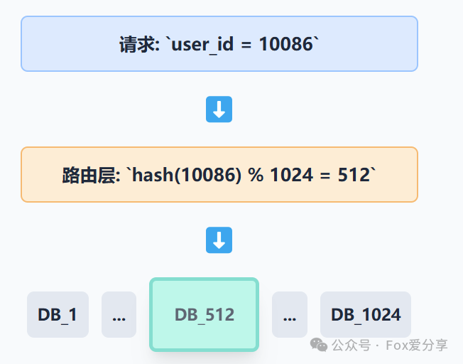 :当一个请求过来时,通过路由层(如Sharding-Sphere中间件或自研路由)对user_id进行哈希计算,再对分片总数取模,决定该请求应该路由到哪个数据库。