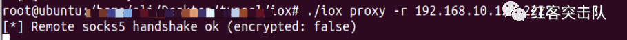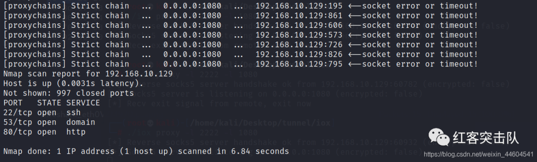 #在本地 0.0.0.0:1080启动Socks5服务./iox proxy -l 1080#在被控机开启Socks5服务,将服务转发到公网VPS#在VPS上转发0.0.0.0:9999到0.0.0.0:1080#你必须将两条命令成对使用,因为它内部包含了一个简单的协议来控制回连./iox proxy -r 1.1.1.1:9999./iox proxy -l 9999 -l 1080      #注意,这两个端口是有顺序的#接着连接内网主机proxychains.confsocks5://1.1.1.1:1080