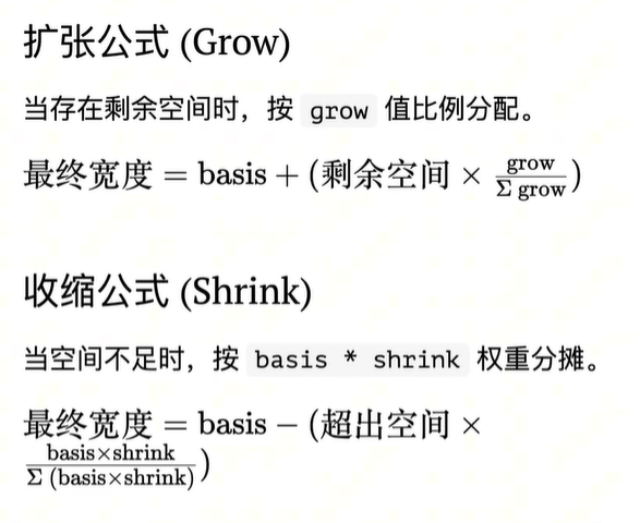 Flex空间分配逻辑Flex空间分配的三步法: 第一步计算所有子元素basis的总和 第二步比较容器宽度和总的basis宽度的 第三步计算容器宽度 总的basis小于容器宽度,应用flex-grow 总的basis大于容器宽度,应用flex-shrink 总的basis等于容器宽度,无需伸缩 整个流程图如下: 计算公式如下图: 计算实战当空间充足时,flex-grow生效,元素尺寸变大一起加大多余的空间当前项的最终宽度 = basis + (容器宽度-总的basis) * 当前项的grow/总的grow,下面来看一个示例 关键代码如下: