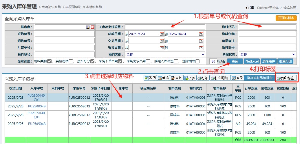 2.进入界面后,按图操作:根据单号或者代码查询,点击查询。然后点击对应物料打印标签