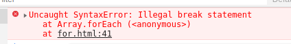 2、定义一个字段用来判断什么时候跳出外层循环 var array = [1,2,3,4,5]; var flag = false; // 为true时说明需要跳出外层循环 for (let i = 0; i < array.length; i++) { for (let j = 0; j < array.length; j++) { if (i==2&&j==2) { flag = true; break; } console.log(i,j); } if (flag) { break; } } 打印出的结果和1中的结果一样。 3、当循环语句写在函数中时直接用return语句终止双重循环 var array = [1,2,3,4,5]; var func = function() { for (let i = 0; i < array.length; i++) { for (let j = 0; j < array.length; j++) { if (i==2&&j==2) { return; } console.log(i,j); } } } func(); 打印出的结果和1中的结果一样,这里使用retun跳出函数,同时也跳出循环语句。 如何跳出forEach循环首先需要注意的是在forEach中不能使用continue和break,否则会报如下错误。