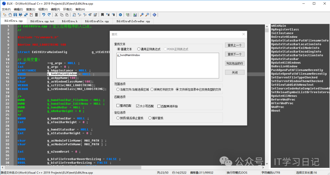 **查找文本时选择"文件所在目录中已支持类型的文件",按"查找下一个",自动搜索当前文件所在目录中包含搜索字符串的其他未打开文件,打开之(就像grep XXX .一样)
